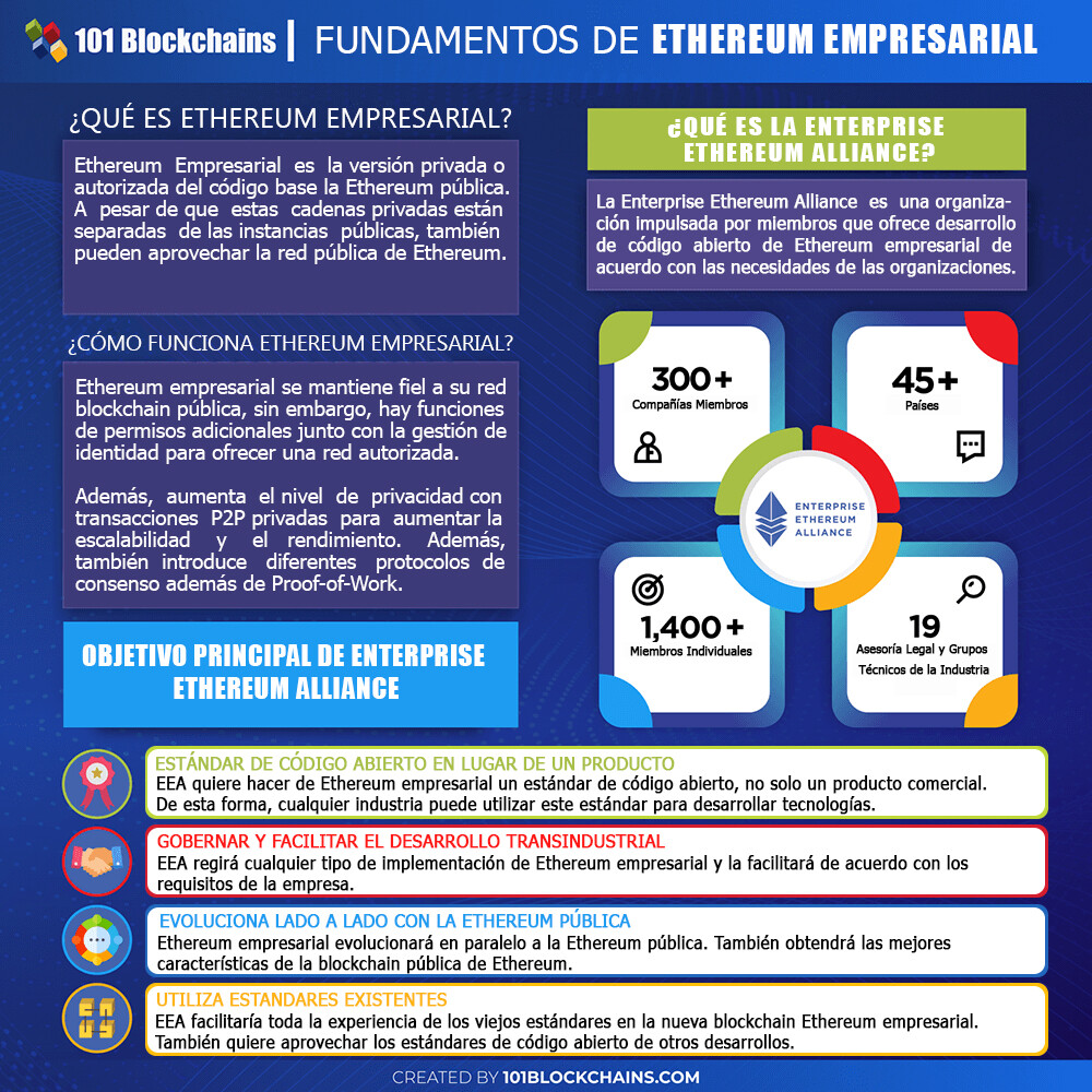 Un Ethereum empresarial es aquel en el que empresas de todo el mundo utilizan el código base de Ethereum para formar redes de cadenas de bloques empresariales. Si bien no existe un único producto denominado " Ethereum empresarial ", el término se refiere de manera holística a las cadenas de bloques que se desarrollan utilizando clientes Ethereum modificados como Quorum y Pantheon. Estos abordan las necesidades específicas de la empresa, como un mayor rendimiento, escalabilidad y privacidad, junto con permisos y controles de gobernanza.