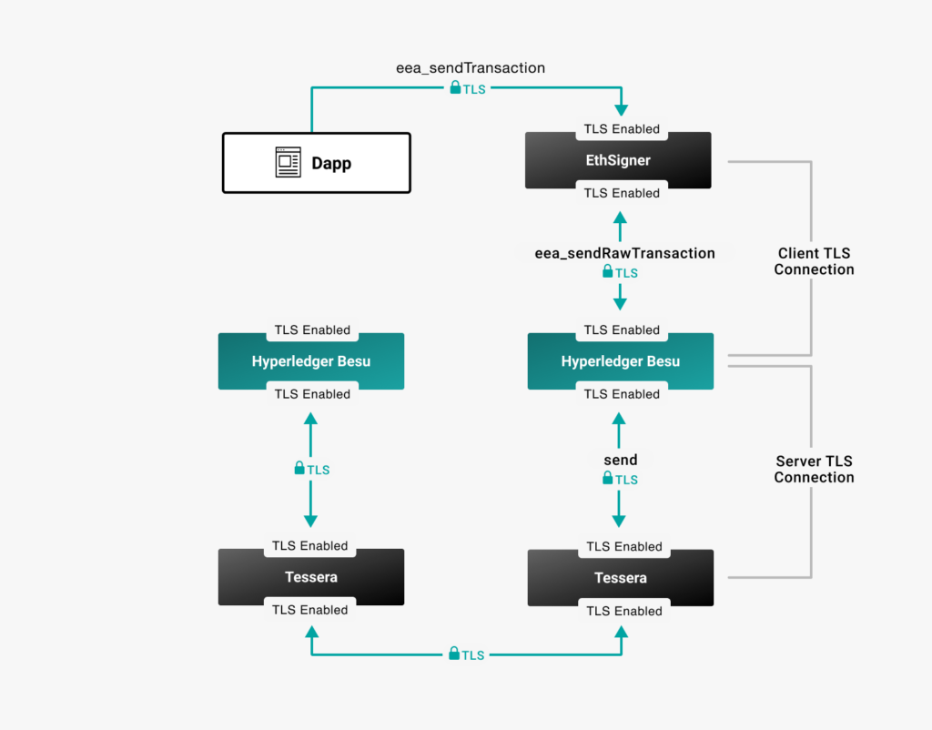 TLS está habilitado en Hyperledger Besu, su gestor de transacciones privado como Orion y EthSigner. En conjunto, estas aplicaciones utilizan TLS entre sí para garantizar que las transacciones estén cifradas de forma segura mediante métodos y técnicas excepcionales, lo que garantiza que los datos se transmitan únicamente a través de entidades autorizadas.