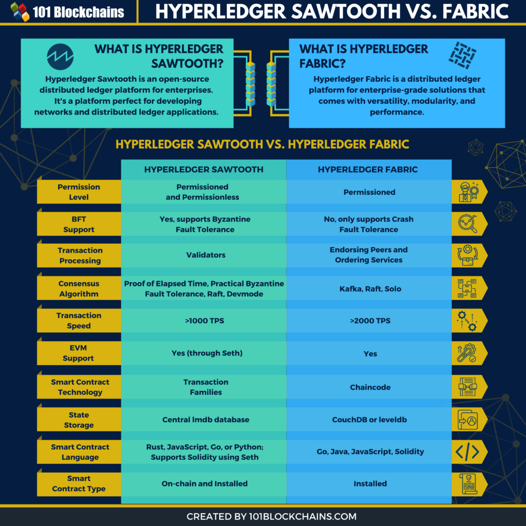 - Hyperledger Fabric utiliza el mecanismo de consenso de Kafka, mientras que Sawtooth utiliza el algoritmo de prueba de tiempo transcurrido (PoET).