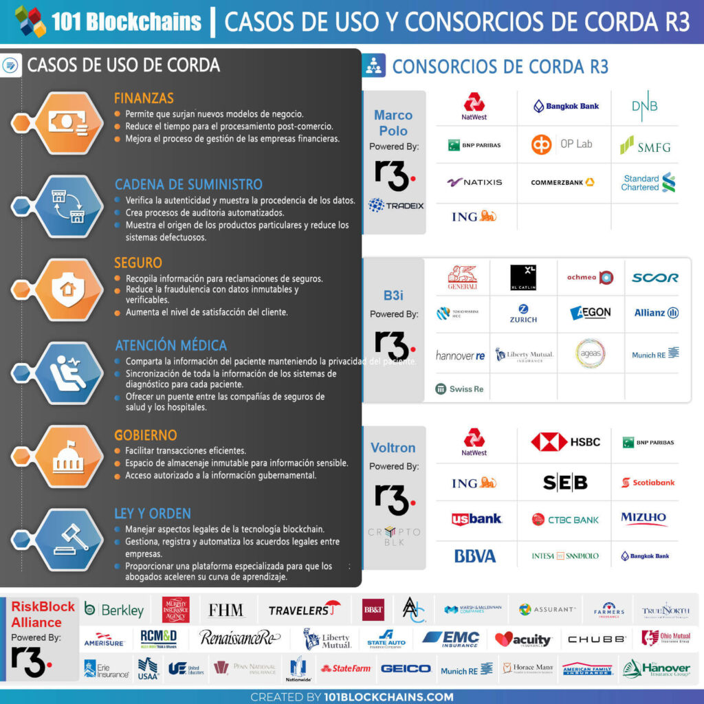 Corda es un proyecto de blockchain de código abierto diseñado para empresas. Se puede utilizar para construir redes de blockchain interoperables que ayuden a realizar transacciones en un entorno privado y seguro. Permite a las empresas realizar transacciones directamente entre sí a través de su tecnología de contratos inteligentes . Permite a las empresas mantener un registro compartido de transacciones, eliminando así la necesidad de que las partes involucradas verifiquen sus transacciones después de interactuar entre sí.